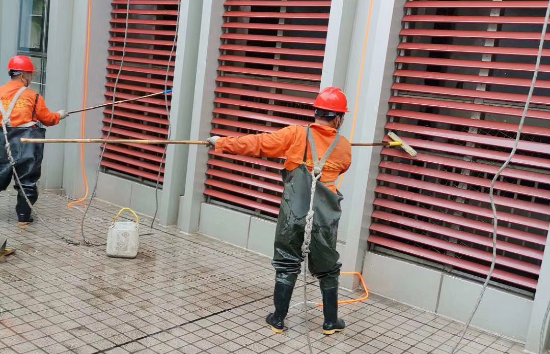 根據(jù)不同建筑結(jié)構(gòu)與墻面材質(zhì),針對(duì)污垢與物體表面結(jié)合力,選用專業(yè)外墻清洗劑和玻璃清潔劑,使用腳手架、支架、吊籃或吊繩,采用包括高壓水槍、清洗機(jī)等設(shè)備進(jìn)行施工操作。